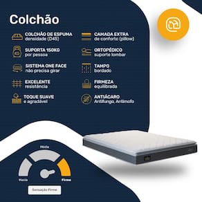 Se busca um colchão que ofereça um descanso profundamente reparador e confortável, nosso modelo com espuma D45 e pillow top é a escolha perfeita. Este colchão é ideal para quem prefere um suporte firme, mas com a suavidade adicional proporcionada pelo pillow top, garantindo uma superfície acolhedora para aliviar pontos de pressão e melhorar a qualidade do sono.