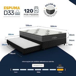 Espuma D33 (colchão principal), EPS (suporte), Malha (revestimento colchão), Espuma D28 (colchão auxiliar), Poliéster (revestimento base), Madeira tratada (estrutura base)Vendido e entregue por Lucas Colchões
