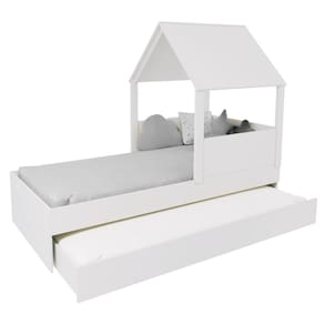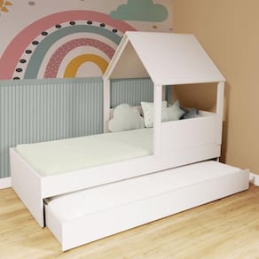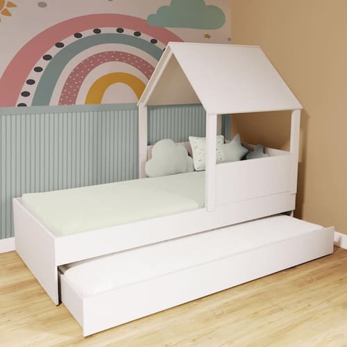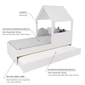 Diferenciais: Auxiliar com 4 rodízios, MDF Melamina 15mm, Estrados em Madeira Maciça, Casinha com Telhado.