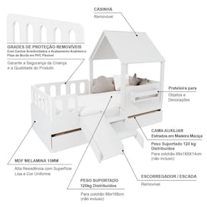 Diferenciais: Auxiliar com 4 rodízios, MDF Melamina 15mm, Estrados em Madeira Maciça, Casinha com Telhado, Kit escada/ escorregador, Grades Anatômicas (Todas as Grades são Removíveis)