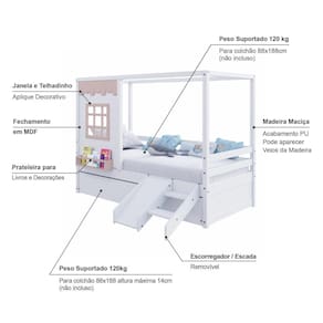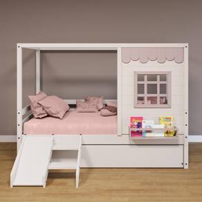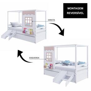 Diferenciais: Auxiliar com 4 rodízios, Kit Escada/ Escorregador, Casinha com fechamento em MDF, Janela e Prateleira para Livros e Decoração, Montagem Reversível (Lado Direito ou Lado Esquerdo)