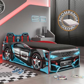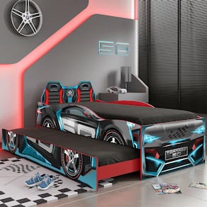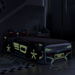 Características: Estrutura em MDF Acabamento em Pintura UV Atóxica Laterais funcionam como grades de proteção Cama auxiliar embutida que pode ser aberta para ambos os lados Estrados reforçados Impressão digital com tinta que brilha no escuro Suporta até 80Kg sem impacto ACOMPANHA COLCHÃO DE 188X88 CM PARA CAMA E CAMA AUXILIAR