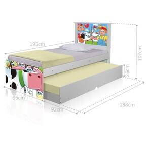 A Bicama Juvenil Barcelona Adesivada Fazendinha Feliz é belíssima e conta com um design funcional, que ocupa pouco espaço no ambiente. A Coleção Fazendinha Feliz foi desenvolvida por nossos designers oferecendo um visual exclusivo, descontraído e divertido ao ambiente. A cama auxiliar fica embaixo da principal e basta puxá-la por meio das corrediças para começar a fazer dela. É ideal para quartos pequenos e para caso precise de uma cama extra para receber um amigo, ou divida o dormitório com alguém. Feita em MDF e MDP e seu acabamento é feito com pintura UV brilhante tornando-a um produto resistente e com aspecto de novo por muito mais tempo. É uma excelente escolha para acomodar colchões de solteiro na medida de 188 cm x 88 cm de largura.