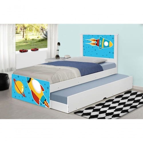 A Bicama Juvenil Barcelona Adesivada Foguete Espacial é belíssima e conta com um design funcional, que ocupa pouco espaço no ambiente. A Coleção Foguete Espacial foi desenvolvida por nossos designers oferecendo um visual exclusivo, descontraído e divertido ao ambiente. A cama auxiliar fica embaixo da principal e basta puxá-la por meio das corrediças para começar a fazer dela. É ideal para quartos pequenos e para caso precise de uma cama extra para receber um amigo, ou divida o dormitório com alguém. Feita em MDF e MDP e seu acabamento é feito com pintura UV brilhante tornando-a um produto resistente e com aspecto de novo por muito mais tempo. É uma excelente escolha para acomodar colchões de solteiro na medida de 188 cm x 88 cm de largura.