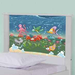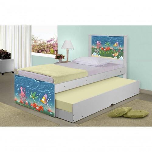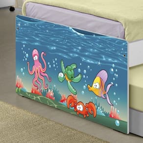 A Bicama Juvenil Barcelona Adesivada Fundo do Mar é belíssima e conta com um design funcional, que ocupa pouco espaço no ambiente. A Coleção Fundo do Mar foi desenvolvida por nossos designers oferecendo um visual exclusivo, descontraído e divertido ao ambiente. A cama auxiliar fica embaixo da principal e basta puxá-la por meio das corrediças para começar a fazer dela. É ideal para quartos pequenos e para caso precise de uma cama extra para receber um amigo, ou divida o dormitório com alguém. Feita em MDF e MDP e seu acabamento é feito com pintura UV brilhante tornando-a um produto resistente e com aspecto de novo por muito mais tempo. É uma excelente escolha para acomodar colchões de solteiro na medida de 188 cm x 88 cm de largura.