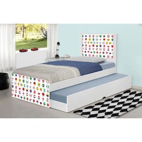 A Bicama Juvenil Barcelona Adesivada Futebol Seleções Copa é belíssima e conta com um design funcional, que ocupa pouco espaço no ambiente. A Coleção Futebol Seleções Copa foi desenvolvida por nossos designers oferecendo um visual exclusivo, descontraído e divertido ao ambiente. A cama auxiliar fica embaixo da principal e basta puxá-la por meio das corrediças para começar a fazer dela. É ideal para quartos pequenos e para caso precise de uma cama extra para receber um amigo, ou divida o dormitório com alguém. Feita em MDF e MDP e seu acabamento é feito com pintura UV brilhante tornando-a um produto resistente e com aspecto de novo por muito mais tempo. É uma excelente escolha para acomodar colchões de solteiro na medida de 188 cm x 88 cm de largura.