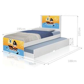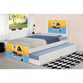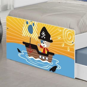 A Bicama Juvenil Barcelona Adesivada Pirata é belíssima e conta com um design funcional, que ocupa pouco espaço no ambiente. A Coleção Pirata foi desenvolvida por nossos designers oferecendo um visual exclusivo, descontraído e divertido ao ambiente. A cama auxiliar fica embaixo da principal e basta puxá-la por meio das corrediças para começar a fazer dela. É ideal para quartos pequenos e para caso precise de uma cama extra para receber um amigo, ou divida o dormitório com alguém. Feita em MDF e MDP e seu acabamento é feito com pintura UV brilhante tornando-a um produto resistente e com aspecto de novo por muito mais tempo. É uma excelente escolha para acomodar colchões de solteiro na medida de 188 cm x 88 cm de largura.