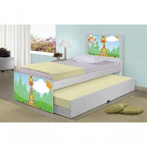 A Bicama Juvenil Barcelona Adesivada Safari Girafa é belíssima e conta com um design funcional, que ocupa pouco espaço no ambiente. A Coleção Safari Girafa foi desenvolvida por nossos designers oferecendo um visual exclusivo, descontraído e diido ao ambiente. A cama auxiliar fica embaixo da principal e basta puxá-la por meio das corrediças para começar a fazer uso dela. É ideal para quartos pequenos e para caso precise de uma cama extra para receber um amigo, ou divida o dormitório com alguém. Feita em MDF e MDP e seu acabamento é feito com pintura UV brilhante tornando-a um produto resistente e com aspecto de por muito mais tempo. É uma excelente escolha para acomodar colchões de solteiro na medida de 188 cm x 88 cm de largura.