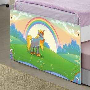 A Bicama Juvenil Barcelona Adesivada Unicórnio Feliz é belíssima e conta com um design funcional, que ocupa pouco espaço no ambiente. A Coleção Unicórnio Feliz foi desenvolvida por nossos designers oferecendo um visual exclusivo, descontraído e divertido ao ambiente. A cama auxiliar fica embaixo da principal e basta puxá-la por meio das corrediças para começar a fazer dela. É ideal para quartos pequenos e para caso precise de uma cama extra para receber um amigo, ou divida o dormitório com alguém. Feita em MDF e MDP e seu acabamento é feito com pintura UV brilhante tornando-a um produto resistente e com aspecto de novo por muito mais tempo. É uma excelente escolha para acomodar colchões de solteiro na medida de 188 cm x 88 cm de largura.