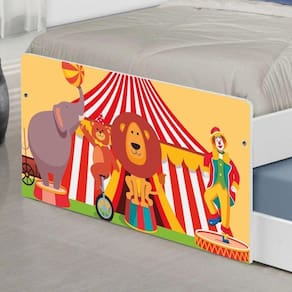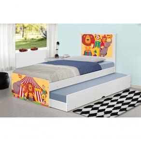 A Bicama Juvenil Barcelona Adesivada Palhaço Circo é belíssima e conta com um design funcional, que ocupa pouco espaço no ambiente. A Coleção Palhaço Circo foi desenvolvida por nossos designers oferecendo um visual exclusivo, descontraído e divertido ao ambiente. A cama auxiliar fica embaixo da principal e basta puxá-la por meio das corrediças para começar a fazer dela. É ideal para quartos pequenos e para caso precise de uma cama extra para receber um amigo, ou divida o dormitório com alguém. Feita em MDF e MDP e seu acabamento é feito com pintura UV brilhante tornando-a um produto resistente e com aspecto de novo por muito mais tempo. É uma excelente escolha para acomodar colchões de solteiro na medida de 188 cm x 88 cm de largura.