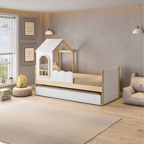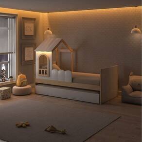 O conjunto Bicama Solteiro com Telhado New Garden Casatema é a solução ideal para otimizar o quarto infantil, combinando uma bicama versátil com o charme de uma casinha.