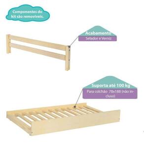 A cama auxiliar conta com dois rodízios e dois pezinhos na parte da frente para proporcionar maior estabilidade e segurança evitando que a cama deslize durante o uso. A cama é cercada por todas as laterais e conta com uma grade de proteção na frente a mesma é de encaixe, oferecendo total segurança para a criança ter uma noite de sono sem sustos. Um móvel incrível para fazer do quarto o local mais divertido da casa. Acompanha Colchão: Não Altura do Conjunto: 68 cm Ambiente: null Ambiente Principal: Quarto Infantil Cor: Marroml Informação Complementar: 1x Cama Auxiliar Prime II MarromlLargura: 188Altura: 21Peso: 13Profundidade: 85.3Necessita Montagem: Sim1x Cama Infantil em Madeira Maciça Prime MarromlLargura: 198Altura: 68Peso: 25Profundidade: 99.59999999999999Necessita Montagem: Sim1x Grade de Proteção em Madeira MarromlLargura: 152 cmAltura: 32 cmPeso: 3,5 kgProfundidade: 6,3 cmNecessita Montagem: Sim Material Principal: Madeira Maciça Possui Portas: Não Suporta Até (kg): 100