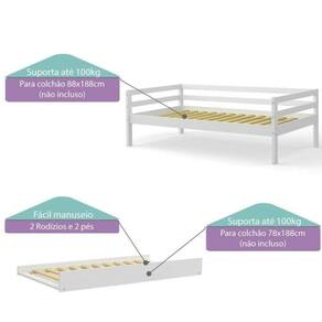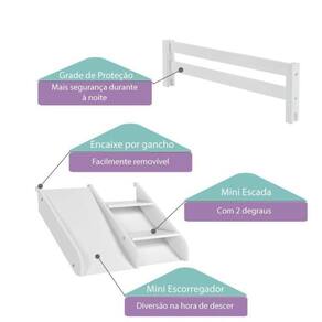 A Casatema é uma loja especializada em Móveis infantis no conceito lúdico, onde a diversão e segurança fazem parte do design de cada peça. Todo o processo de construção de nossos móveis é baseado nas experiências de nossas crianças, o que torna nossos produtos inovadores no mercado! A Bicama infantil Prime e Kit Escadinha com Escorregador é um mimo para o quarto da criança! Um jeito encantador de fazer a transição do berço para a cama. Para uma aventura tranquila aos olhos dos pais, o escorregador e escadas são baixinhos, o que suaviza a subida e descida da criança. Um móvel perfeito para quarto compacto, pois a cama auxiliar com 2 rodízios pode ser recolhida após o uso, deixando sempre o quarto organizado e com livre circulação. Acompanha Colchão: Não Altura do Conjunto: 68 cm Ambiente Principal: Quarto Infantil codigo_ean: 7908308723146 Cor: Branco Informação Complementar: 1x Cama Infantil em Madeira Maciça e Acabamento em Laca Prime BrancoLargura: 198 cmAltura: 68 cmPeso: 25 kgProfundidade: 99,6 cmNecessita Montagem: Sim1x Cama Auxiliar Prime II Laca BrancoLargura: 188 cmAltura: 21 cmPeso: 13 kgProfundidade: 85,3 cmNecessita Montagem: Sim1x Grade de Proteção IV em Madeira Maciça BrancoLargura: 110Altura: 32Peso: 3Profundidade: 6.3Necessita Montagem: Sim1x Kit Escadinha com Mini Escorregador II BrancoLargura: 67Altura: 41Peso: 5Profundidade: 49Necessita Montagem: Sim Material Principal: Madeira Maciça Possui Portas: Não Tipo de Cama: Bicama Tipo de Colchão: Solteiro