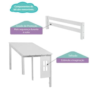 A cama é cercada por todas as laterais, seja com barras ou com a grade IV. O kit escadinha/escorrega conta com uma estrutura baixa, suavizando a descida e a subida das crianças na cama. O Telhado traz todo o lúdico para o quarto, pois tranforma a cama em uma linda casinha. A cama auxiliar é leve, de fácil manuseio, o que facilita no momento de retirar e recolher. A peça ideal para trazer o lúdico, a diversão e a segurança para os dias e noites das crianças. Acompanha Colchão: Não Altura do Conjunto: 115 cm Ambiente: null Ambiente Principal: Quarto Infantil Cor: Branco Informação Complementar: 1x Cama Infantil em Madeira Maciça e Acabamento em Laca Prime BrancoLargura: 198Altura: 68Peso: 25Profundidade: 99.59999999999999Necessita Montagem: Sim1x Cama Auxiliar Prime II Laca BrancoLargura: 188Altura: 21Peso: 13Profundidade: 85.3Necessita Montagem: Sim1x Grade de Proteção IV em Madeira Maciça BrancoLargura: 110Altura: 32Peso: 3Profundidade: 6.3Necessita Montagem: Sim1x Kit Telhado II com Janelinha para Camas Infantis BrancoLargura: 75Altura: 115Peso: 12Profundidade: 115Necessita Montagem: Sim1x Kit Escadinha com Mini Escorregador II BrancoLargura: 67Altura: 41Peso: 5Profundidade: 49Necessita Montagem: Sim Material Principal: Madeira Maciça Possui Portas: Não