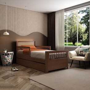 A Bicama Solteiro Infantil Wave é perfeita para um quarto infantil ou juvenil, oferecendo segurança, conforto e um design contemporâneo com detalhes naturais em rattan (sintético - pvc). Este modelo conta com grade de proteção em estilo palito e iluminação LED embutida, criando um ambiente acolhedor e seguro para o sono e descanso dos pequenos. Além disso, a cama auxiliar é prática e ideal para acomodar visitas ou irmãos. O design funcional e o acabamento em madeira natural fazem deste móvel uma peça sofisticada e funcional para o dia a dia. Acompanha Cama Auxiliar: Sim Acompanha Colchão: Não Altura do Conjunto: 91 cm Altura do Estrado até o Chão: 29 cm Ambiente Principal: Quarto Infantil Cama Auxiliar Acompanha Colchão: Não Cama Auxiliar com Rodízio: Sim Cama Auxiliar Suporta Até (kg): 100 kg codigo_ean: 7900288245991 Cor: Freijó Cor do Produto: Freijó Escala de Brilho: Semi-Brilho Informação Complementar: 1x Cama Solteiro Juvenil Reversivel em Rattan com Led Wave Freijó Largura: 202,2 cm Altura: 91 cm Peso: 31 kg Profundidade: 94,2 cm Necessita Montagem: Sim