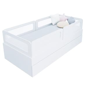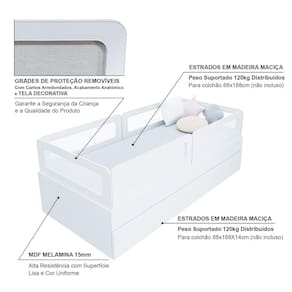 Diferenciais: Auxiliar com 4 rodízios, MDF Melamina 15mm, Estrados em Madeira Maciça, 04 Grades e Cabeceira e Peseira Anatômica com Tela PVC e Poliéster.