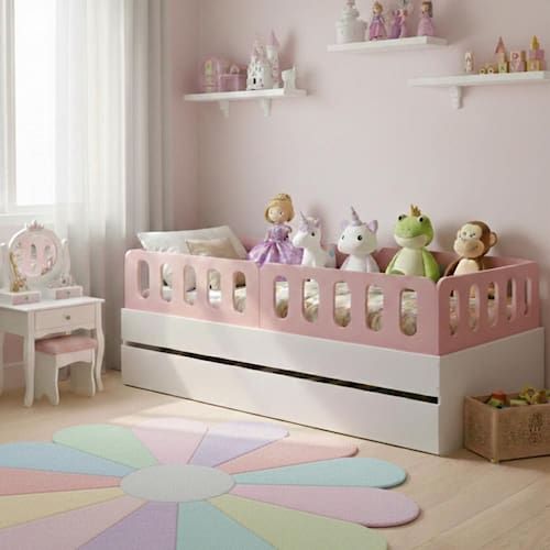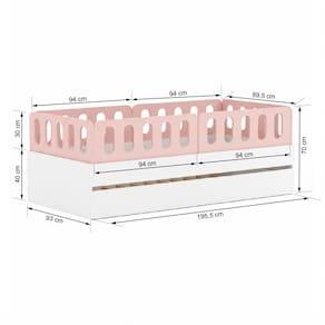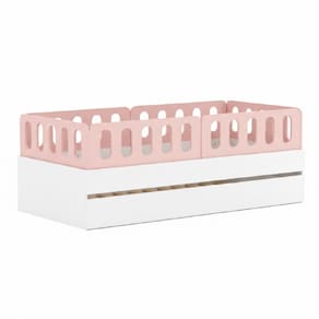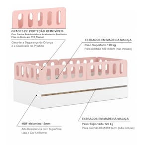 Diferenciais: Auxiliar com 4 rodízios, MDF Melamina 15mm, Estrados em Madeira Maciça, 04 Grades e Cabeceira e Peseira Anatômica.