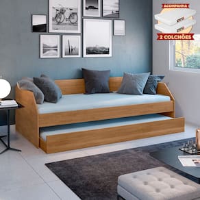 Bicama Solteiro Multifuncional Duo com Cama Auxiliar em Mdf Premium com 2 Colchões Amendoa - Marrom