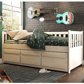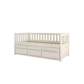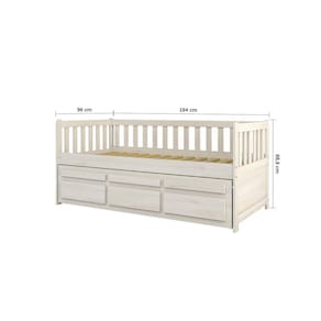Bicama Solteiro Reta 3 Gavetas Móveis Saraiva, madeira maciça de Pinus. Cama auxiliar possui sistema de rodízio fixo, gavetas todas com corrediças em madeira central com deslizante em plástico, Estrados em madeira de pinus largura 20mm. Estação de Dormir com Cama de Casal, cama auxiliar possuí sistema de rodízio fixo, gavetas com corrediças em madeira central com deslizante em plastico. Estrados em madeira de pinus largura 20mm estrutura, madeira maciça. Sem falar da pintura delicada do branco lavado que traz aos detalhes dos veios da madeira maciça. Acabamento da Gaveta: Pintura Acompanha Cama Auxiliar: Sim Acompanha Colchão: Não Acompanha Dossel: Não Acompanha Móbile: Não Acompanha Suporte para Mosquiteiro: Não Altura do Estrado até o Chão: 47 cm Ambiente: Quarto Cama Auxiliar Acompanha Colchão: Não Cama Auxiliar com Rodízio: Sim Cama Auxiliar Suporta Até (kg): 120 kg Complexidade da Montagem: Baixa: pode ser montado por uma pessoa sozinha Cor: Branco Lavado Cor do Produto: Branco Lavado Escala de Brilho: Fosco Escala de Brilho da Gaveta: Fosco Extensível: Não Gaveta com Chave: Não Itens Inclusos: 1 Bicama e Manual de Montagem. Manual de Montagem e Instalação: https://cdn2.madeiramadeira.com.br/atributo/moveis-saraiva/545073-it-bicama-reta.pdf Material da Gaveta: Madeira Maciça Material do Estrado: Pinus Material Principal: Madeira Maciça Necessita Montagem: Sim Origem do Produto: Nacional Permite a Utilização de Cama Auxiliar: Sim Peso: 53 kg Peso Máximo por Gaveta: 5 kg Possui Baú: Não Possui Gavetas: 03 Possui Pés: Não Possui Portas: Não Possui Prateleiras: Não Possui Rodízio: Sim Recomendações de Uso, Manutenção e Limpeza: Limpeza com pano umedecido, não aplicar lustra móveis. Resistente à Chuva: Não Rodízio com Trava: Não Sapatas Niveladoras: Não Sistema de Montagem: Parafusos Tamanho do Colchão Indicado (L x C): 88cm x 188cm Tamanho do Colchão Indicado Cama Auxiliar: 14cm x 89cm x 188c Tipo de Cama: Bicama Tipo de Colchão: Solteiro Tipo de Corrediça da Gaveta: Madeira Tipo de Estrado: Removível Tipo de Madeira Maciça: Pinus Tipo de Madeira Maciça da Gaveta: Pinus Tipo de Puxador da Gaveta: Embutido