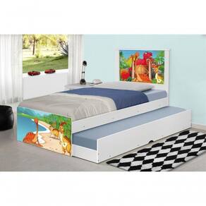 A Bicama Juvenil Barcelona Adesivada Terra dos Dinossauros é belíssima e conta com um design funcional, que ocupa pouco espaço no ambiente. A Coleção Terra dos Dinossauros foi desenvolvida por nossos designers oferecendo um visual exclusivo, descontraído e diido ao ambiente. A cama auxiliar fica embaixo da principal e basta puxá-la por meio das corrediças para começar a fazer uso dela. É ideal para quartos pequenos e para caso precise de uma cama extra para receber um amigo, ou divida o dormitório com alguém. Feita em MDF e MDP e seu acabamento é feito com pintura UV brilhante tornando-a um produto resistente e com aspecto de por muito mais tempo. É uma excelente escolha para acomodar colchões de solteiro na medida de 188 cm x 88 cm de largura.