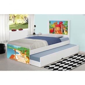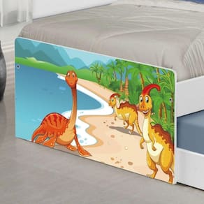 A Bicama Juvenil Barcelona Adesivada Terra dos Dinossauros é belíssima e conta com um design funcional, que ocupa pouco espaço no ambiente. A Coleção Terra dos Dinossauros foi desenvolvida por nossos designers oferecendo um visual exclusivo, descontraído e divertido ao ambiente. A cama auxiliar fica embaixo da principal e basta puxá-la por meio das corrediças para começar a fazer dela. É ideal para quartos pequenos e para caso precise de uma cama extra para receber um amigo, ou divida o dormitório com alguém. Feita em MDF e MDP e seu acabamento é feito com pintura UV brilhante tornando-a um produto resistente e com aspecto de novo por muito mais tempo. É uma excelente escolha para acomodar colchões de solteiro na medida de 188 cm x 88 cm de largura.