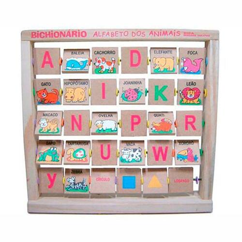 Fabricado em madeira PINUS, contém 30plaquinhas sendo de um lado da placa a figura do animal e do outro a letra inicial maiúsculas. Composto também por 4 plaquinhas de figuras geométricas.