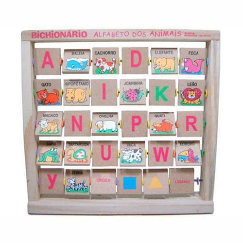 Bichonário Em Madeira - Alfabeto Dos Animais Dicá Fabricado em madeira pinus, contém 30 plaquinhas sendo de um lado da placa a figura do animal e do outro a letra inicial maiúsculas. Composto também por 4 plaquinhas de figuras geométricas. Excelente brinquedo que promove associação entre o desenho e a letra. Através deste produto, o professor ensina o processo inicial de leitura-escrita, fazendo com que as crianças percebam as letras iniciais dos nomes de animais mais conhecidos, que são utilizados no seu dia a dia. Desenvolve a atenção, concentração, discriminação entre figuras e percepção visual ocorrendo de uma maneira fácil e muito divertida. Idade: a partir de 3 anos. Certificação Inmetro: CE-BRI/ICEPEX-N 00174-82 NM300/2002.