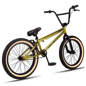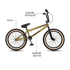 Já no quesito características técnicas as expectativas são superadas mais uma vez, contém uma cor linda no Douradol! Os pneus são largos, resistentes contedo uma faixa bege. O Quadro e guidão reto e pegs são construídos em Aço Hi-Ten, um aço excepcionalmente durável, leve e altamente resistente a oxidação e impactos típicos da prática esportiva do BMX. Para completar, os freios são U-Brake, Aro 20, super reforçado para realizar manobras radicais, com segurança e confiança e, ainda, pedivela monobloco. Tudo para garantir uma experiência incrível e inesquecível.