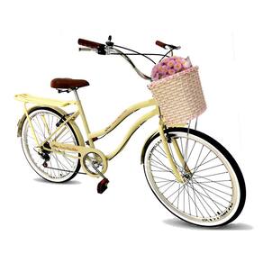 Bicicleta aro 26 modelo retrô cesta tipo vime 6 marchas bege