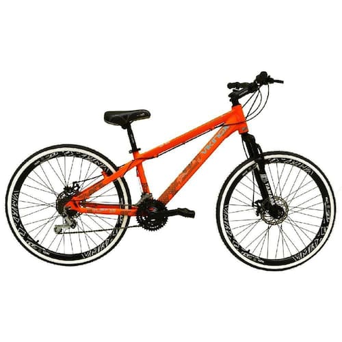 Quadro 26 VikingX Tuff em Alumínio Laranja x30 (segunda imagem) Garfo 29 suspensão Suporte do guidão em alumínio preto Guidão 31.8mm em alumínio preto Canote do selim 27.2 em alumínio preto Sem carrinho Selim Pro-X Freeride ou Yamada Mtb (dependerá da disponibilidade no estoque) Abraçadeira do Selim alumínio Preto Aros Vmaxx Pretos Super reforçados Raios pretos ou zincados Cubos Pretos Pneus 26x1.5 Slick com faixa branca Movimento central selado rolamentado Freios a disco Mecânicos com discos inox 160mm Alavancas Semi-automáticas Rapid Fire Câmbio Traseiro Importado Câmbio Dianteiro Importado Corrente Index Pedivela Aço Revestido Pedal Plataforma Nylon preto Roda Livre 7v index dourada(rosca)