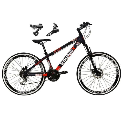 Bike aro 26, VIKINGX TUFF, nova na caixa a pronta entrega, produto com ótima qualidade e acabamento, possui 21 marchas com sistema de alavancas rapid fire que a cada clique uma marcha é trocada, sistema de freio a disco mecânico, pneus slick 1.5 com faixa branca. Bicicleta pré montada, vai precisar apenas fixar a roda dianteira, guidão, selim e pedais. Segue abaixo características da bike: Quadro 26 VikingX Tuff em Alumínio / Garfo aço preto 60mm suspensão / Suporte do guidão em alumínio preto / Guidão 31.8mm em alumínio preto / Canote do selim 27.2 em alumínio preto Sem carrinho / Selim Pro-X Freeride ou Yamada Mtb (dependerá da disponibilidade no estoque) / Abraçadeira do Selim alumínio Preto / Aros Vmaxx Super reforçados / Raios Finos / Cubos Pretos / Pneus 26x1.5 Slick com faixa branca / Movimento central selado rolamentado / Freios a disco Mecânicos com discos inox 160mm / Alavancas Semi-automáticas Rapid Fire / Câmbio Traseiro Shimano TZ / Câmbio Dianteiro Shimano TZ / Corrente Index / Pedivela Aço Revestido / Pedal Plataforma Nylon preto / Roda Livre 7v index dourada