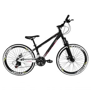 Bicicleta Aro 26 Vikingx Tuff X44 Preto/branco 21v Alumínio Freio A Disco Aros Vmaxx Pretos Bike aro 26, VIKINGX TUFF X44 !!! , nova na caixa a , produto com ótima qualidade e acabamento, possui 21 marchas com sistema de alavancas rapid fire que a cada clique uma marcha é trocada, sistema de freio a disco mecânico, pneus slick . Bicicleta pré montada, vai precisar apenas fixar a roda dianteira, guidão, selim e pedais. Segue abaixo características da bike: Quadro 26 VikingX Tuff X-44 grafismo em Alumínio / Garfo aço suspensão / Suporte do guidão em alumínio preto / Guidão preto / Canote do selim preto Sem carrinho / Selim Sport Preto Mtb / Abraçadeira do Selim alumínio Preto / Aros Vzan Vmaxx Super reforçados / Raios Finos / Cubos Pretos / Pneus Slick / Movimento central selado rolamentado / Freios a disco Mecânicos com discos inox 160mm / Alavancas Semi-automáticas Rapid Fire / Câmbio Traseiro / Câmbio Dianteiro / Corrente Index / Pedivela Aço Revestido Pedal / Plataforma Nylon preto / Roda Livre 7v index dourada