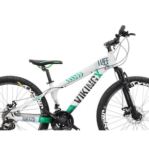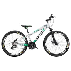 Bicicleta Aro 26 VikingX Tuff25 27v Freio Hidráulico e Trava COMPONENTES DA BIKE - Quadro: Alumínio Viking Tuff X 25 - Suspensão de 100mm com Trava no Ombro - Aros Vzan Vmaxx SL - Raios Zincados Pretos - Pneus Aro 26 Com Arame - Camara de ar 26 - Jogo Direção Ahead Set - Suporte Do guidão de Alumínio - Guidão em Alumínio - Canote do Selim em Alumínio - Pedal em Plataforma Comum - Arruela Calço para Ahead Set (3 unidades) - Manopla Mtb Comum Confort - Abraçadeira do Selim com Blocagem - Selim - Disco de Freio De 160mm Parafusos - Freio a Disco Hidráulico com Pastilha RELAÇÃO (TRANSMISSÃO DA BIKE) - Cassete de 9v - Roda Tripla De Alumínio - Trocador Semi Automático Rapid Fire de 9V - Cambio Dianteiro Indexado 3V Importado - Cambio Traseiro Indexado 9V Importado - Cubos Sistema Cassete esferado - Corrente Indexada 9V - Jogo de Centro Blindado - Cubos Esferados
