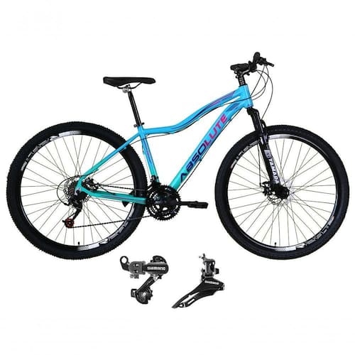 Bike aro 29, com quadro Absolute Hera, nova na caixa a pronta , produto com ótima qualidade e acabamento, possui Freios a disco, Câmbio dianteiro e traseiro Shimano, 21 marchas com sistema de alavancas rapid fire que a cada clique uma marcha é trocada, garfo com suspensão. Bicicleta pré montada, vai precisar apenas fixar a roda dianteira, guidão, selim e pedais.
