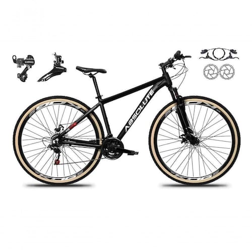 Bike aro 29 Absolute Nero 5 em alumínio, nova na caixa a , produto com ótima qualidade e acabamento, possui 24 marchas com câmbio dianteiro e traseiro Shimano e sistema de alavancas rapid fire que a cada clique uma marcha é trocada, garfo com suspensão, sistema de freio a disco hidráulico(óleo). Quadro com tubo rebaixado para facilitar subir e descer da bike. Bicicleta pré montada, vai precisar apenas fixar a roda dianteira, guidão, selim e pedais. Segue abaixo características da bike: Quadro 29 Absolute Nero 5 em alumínio 6061Garfo 29 suspensão curso 60mm / Suporte do guidão em alumínio preto / Guidão 31.8mm em alumínio preto / Canote do selim 27.2 s/carrinho / Selim Sport preto / Abraçadeira do Selim alumínio Preto / Aros Aero Parede dupla reforçado / Raios Pretos / Cubos Pretos aço / Pneus 29 cravudo / Movimento central selado rolamentado /Freios a disco Hidráulicos(a óleo) com discos inox 160mm / Alavancas Semi-automáticas Rapid Fire / Câmbio Traseiro shimano tz / Câmbio Dianteiro shimano tz / Corrente Index / Pedivela Aço Revestido / Pedal Plataforma Nylon preto / Roda Livre 8v index dourada (rosca).