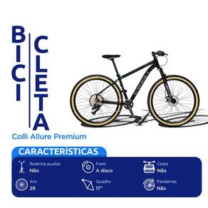 Caracteristicas: Marca: Colli Modelo: Allure Premium Aro: 29 Marchas: Sim Quantidades de marchas: 12 marchas Tamanho do quadro: 17 Freio: Freio a disco hidraulico Pedivela: 34 dentes com 175 mm Cambio traseiro: 12VL importado Cambio dianteiro: Alavanca de cambio 12VL importado Garfo: Aluminio Material do cubo: Aluminio Guidao: Aluminio Banco: Sem molas Suspensao: Sim Corrente: Fina 126 EL Pneus: 28 x 2.10 Cesta: Nao Paralamas: Nao Suporte para garrafa: Nao