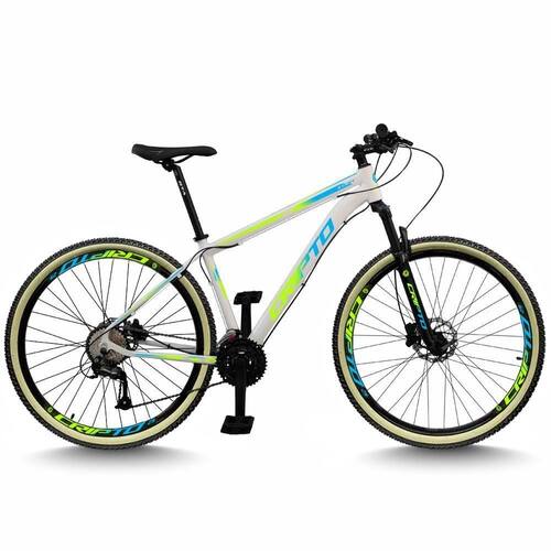 Suspensão: Dianteira | Modalidade: Mountain Bike | Aro: 29 | Marchas: 24 Cor: Branco/Verde e Azul