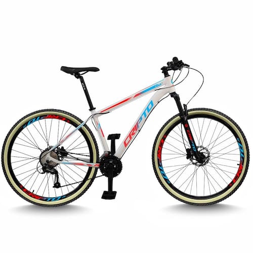 Bicicleta Aro 29 Cripto 24 Marchas Freios Disco e Suspensão Pneu Bege - 21"-Branco/Azul e Vermelho