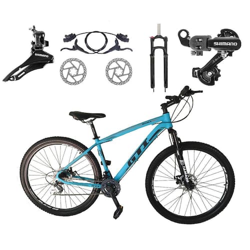 Bike aro 29, com quadro GTI ROMA, nova na caixa a pronta entrega, produto com ótima qualidade e acabamento, possui 24 marchas com sistema de alavancas rapid fire que a cada clique uma marcha é trocada, câmbio dianteiro e traseiro SHIMANO, Catraca do tipo k7 de encaixe, garfo com suspensão e sistema de trava para melhor performance, sistema de freio a disco hidráulico, pneus com cravo baixo para uso em terra e asfalto. Bicicleta pré montada, vai precisar apenas fixar a roda dianteira, guidão, selim e pedais. Segue abaixo características da bike: Quadro 29 GTI ROMA em Alumínio / Garfo 29 suspensão com Trava no Ombro / Suporte do guidão em alumínio preto / Guidão 31.8mm em alumínio preto / Canote do selim 27.2 em alumínio preto Com carrinho / Selim Sport preto / Abraçadeira do Selim alumínio Preto / Aros Aero Parede dupla reforçado / Raios Pretos / Cubos Pretos Alumínio para K7 com blocagens / Pneus 29 Com Cravo / Movimento central selado rolamentado / Freios a disco Hidráulicos com discos inox 160mm / Alavancas Semi-automáticas Rapid Fire Sunrun gta / Câmbio Traseiro SHIMANO TZ PRETO / Câmbio Dianteiro SHIMANO TZ PRETO / Corrente IndexPedivela Alumínio Triplo / Pedal Plataforma Nylon preto / Cassete K7 8v gta preto ou prata(ENCAXE)