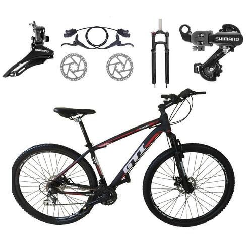 Bike aro 29, com quadro GTI ROMA, nova na caixa a pronta entrega, produto com ótima qualidade e acabamento, possui 24 marchas com sistema de alavancas rapid fire que a cada clique uma marcha é trocada, câmbio dianteiro e traseiro SHIMANO, Catraca do tipo k7 de encaixe, garfo com suspensão e sistema de trava para melhor performance, sistema de freio a disco hidráulico, pneus com cravo baixo para uso em terra e asfalto. Bicicleta pré montada, vai precisar apenas fixar a roda dianteira, guidão, selim e pedais. Segue abaixo características da bike: Quadro 29 GTI ROMA em Alumínio / Garfo 29 suspensão com Trava no Ombro / Suporte do guidão em alumínio preto / Guidão 31.8mm em alumínio preto / Canote do selim 27.2 em alumínio preto Com carrinho / Selim Sport preto / Abraçadeira do Selim alumínio Preto / Aros Aero Parede dupla reforçado / Raios Pretos / Cubos Pretos Alumínio para K7 com blocagens / Pneus 29 Com Cravo / Movimento central selado rolamentado / Freios a disco Hidráulicos com discos inox 160mm / Alavancas Semi-automáticas Rapid Fire Sunrun gta / Câmbio Traseiro SHIMANO TZ PRETO / Câmbio Dianteiro SHIMANO TZ PRETO / Corrente IndexPedivela Alumínio Triplo / Pedal Plataforma Nylon preto / Cassete K7 8v gta preto ou prata(ENCAXE)