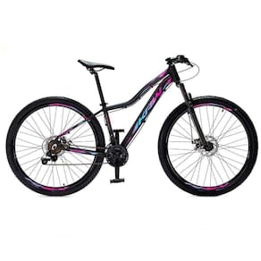 Modalidade: MTB | Marchas: 24 | Suspensão: Dianteira | Material do Quadro: Aluminio | Aro: 29 Cor: Preto/Rosa e Azul