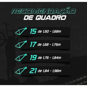 - A geometria do quadro (desenho) pode mudar conforme o tamanho escolhido alterando a inclinação do tubo superior quando quadro é 21 deixando-o mais reto.