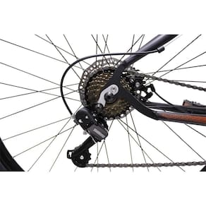 Freio a Disco Mecânico 160mm. Pedivela Aço Revestido Nylon 24/34/42D Index. Roda Livre 7v 14/28D Index. Corrente fina 7v Index.