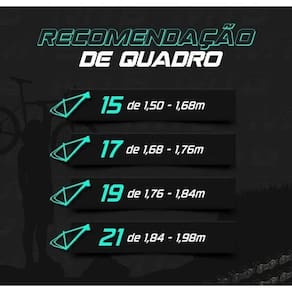 - A geometria do quadro (desenho) pode mudar conforme o tamanho escolhido alterando a inclinação do tubo superior quando quadro é 21 deixando-o mais reto.