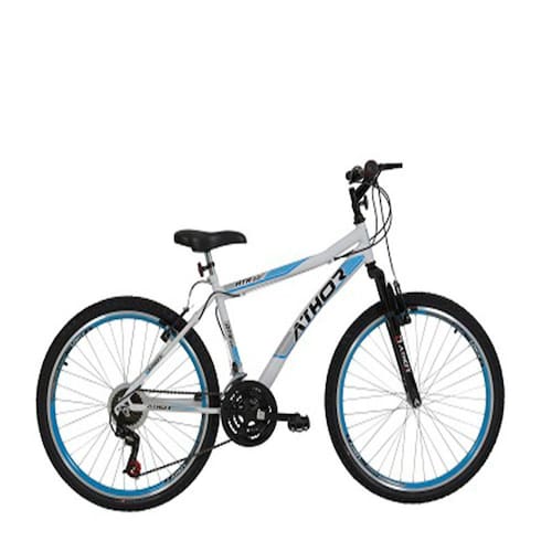 Modelo / Referência: ATR 3.0 Aro: Alumínio Aero Classificação: Adulto Cores disponíveis: Branca com Azul Gênero: Masculino 21 Velocidades Quadro aço carbono - Tubão 2 Freio: V-Brake Protetor de raio Guidão: D Hill S/suporte Movimento central 34.7mm Suporte guidão 21mm Garfo suspensão
