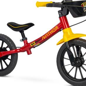 A bicicleta Balance Nathor conta com limitador de giro do guidão (garantindo mais segurança), pneus em E.V.A. (mais leves e antiderrapantes), freio traseiro a tambor e regulagem de altura do selim de PU.