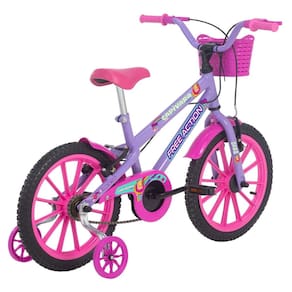 Caracteristicas: Aro: Polipropileno Quadro: Quadro aco carbono Garfo: Rigido Guidao: Guidao aco carbono 540 mm Freios: Freios V-Brake Rodas laterais: sim Para-lamas: sim Manoplas: Tiger Corrente: Corrente grossa 1/2 X 1/8 Selim: Selim toy Cobre-Corrente: Virgula Roda Livre: Roda livre 18 d Pedivela: Pedivela monobloco 115 mm preto Engrenagem: Engrenagem 32 D aco preta Pneus: Pneu 16 x 1,75 cross preto Movimento central: Movimento centra 45 c/ colar Peso Maximo recomendado -kg-: 51 kg