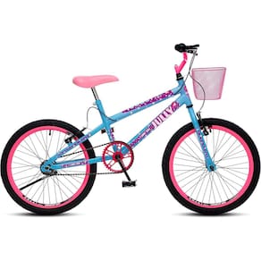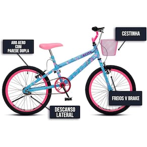 Bicicleta Colli Jully, Aro 20 aero 36 raias, Freios v-brake dianteiro e traseiro, Suporte de guidão down hill e cestinha.