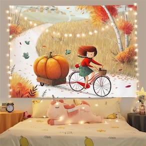Material: pelúcia, faixa de luz Tamanho: 150 cm × 130 cm Peso: 260 g Cena encantadora de outono: apresenta uma paisagem de outono extravagante com uma garota andando de bicicleta carregando uma abóbora, perfeita para adicionar um toque aconchegante e inspirado no outono ao seu quarto. Tecido de lã macia: feita de lã macia e macia, esta tapeçaria oferece uma textura confortável e é durável para uso duradouro. Inclui luzes LED: vem com luzes LED de fada embutidas para adicionar um brilho aconchegante e convidativo ao seu espaço, criando um ambiente aconchegante. Tamanho ideal para qualquer ambiente: mede 59 x 51 polegadas, ideal para pendurar em quartos, dormitórios ou salas de estar como uma bela peça de decoração de outono. Fácil de cuidar: esta tapeçaria é lavável à máquina e resistente a rugas, mantendo sua decoração fresca e vibrante durante toda a temporada.