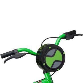 Super equipada com placa frontal exclusiva do Ben 10 no formato do Ominitrix, adesivos que brilham no escuro, selim estampado e cobre-corrente envolvente.